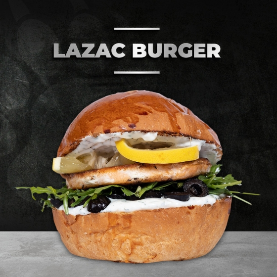 20 dkg marhahús pogácsa, burger szósz, rukkola, jalapeno, paradicsom, oliva, gorgonzola sajt